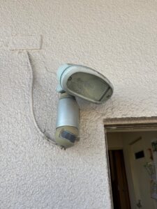今回交換したのは、長年屋外に設置されていたDELCATEC(デルカテック)製のセンサーライトです。現地で調査を行ったところ、人の動きを感知しても全く点灯しない状態でした。長期間の野外設置により、センサーの検知窓が経年劣化で白く濁っており、赤外線を正しく受信できなくなっていたことが故障の主な原因です。